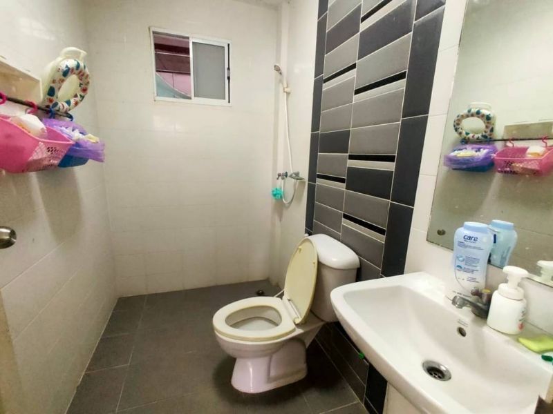มีโรงจอดรถด้านหน้า เดินเข้าตัวบ้านเย็นสบาย หลังนี้จะเย็นตลอดปี เพราะบ้านหันหน้าทิศใต้ ลมเย็นสบาย พื้นปูกระเบื้องแกรนิตแผ่นใหญ่ สะอาดตา ประตูหน้าต่างมีเหล็กดัดมุ้งลวดครบ มีห้องน้ำสำหรับแขก ทะลุไปด้านหลังบ้านเป็นครัวใหญ่ เคาน์เตอร์ครัวครบเซ็ต